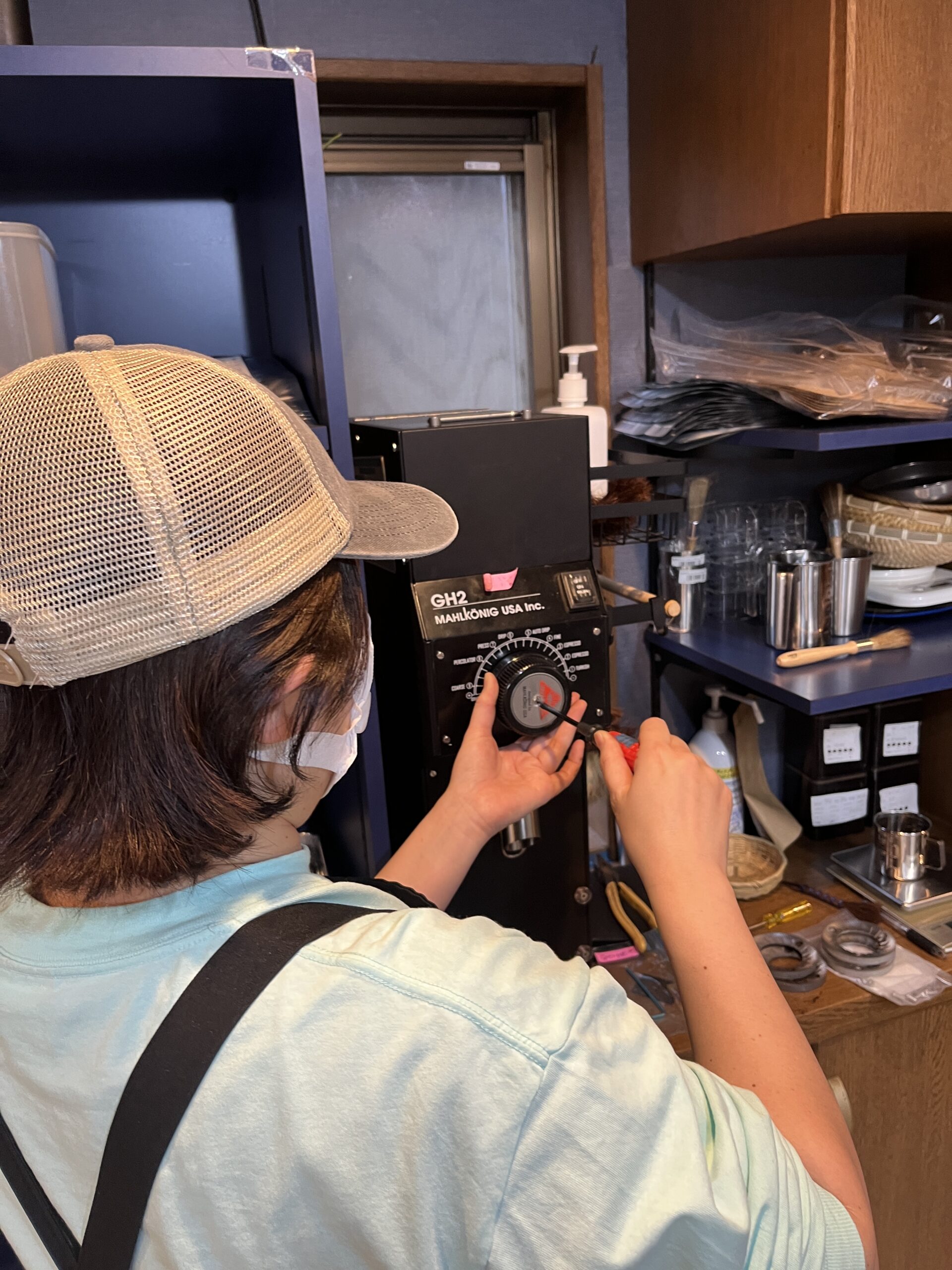 分解清掃したグラインダーを店長さんが組み上げます