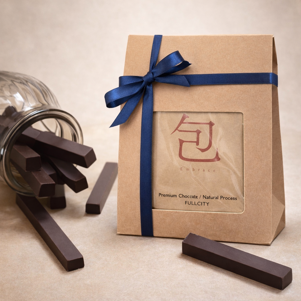 ■ Embrace|包 Premium Chocolat / Natural Process Origin: Brazil Roast Level: Full City (Medium–Dark) The coffee’s rich body and chocolate-like character gently embrace the chocolate’s milky sweetness. Both melt together, creating a calm and reassuring finish.